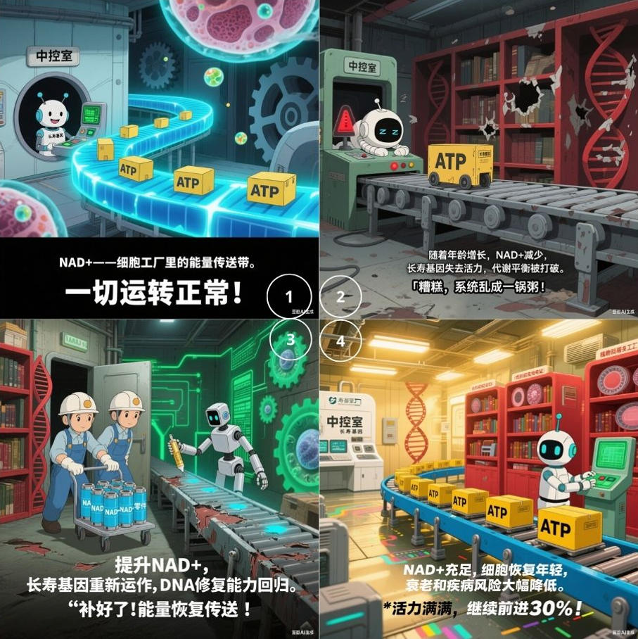 首先,提升NAD+,细胞里的长寿基因功能全面恢复,细胞的运作重回年轻。