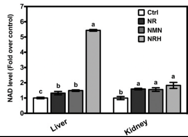 根据他们的研究,分别给小鼠补充NR、NMN、NRH,检测组织中NAD+含量的变化,结果显示,在肝脏组织中,NRH能显著提升NAD+水平,效果远超NR和NMN;而在肾脏组织中,三种前体对NAD+的提升幅度相近。