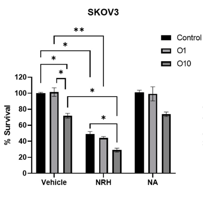 当NRH组合奥拉帕利使用时,可以进一步增强对卵巢癌细胞的杀伤效果,在某些对奥拉帕利比较敏感的卵巢癌细胞系中,NRH可以增强奥拉帕利的杀伤性高达100%。